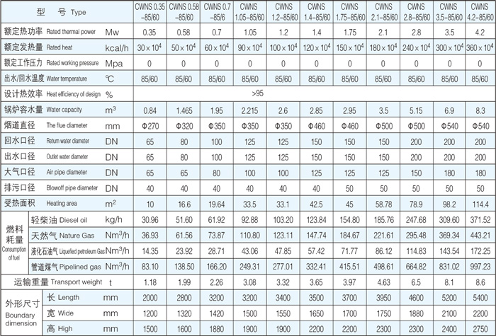 1、CWNS型系列為臥式內(nèi)燃濕背式鍋殼鍋爐。由鍋殼、爐膽、回燃室、前后煙箱、火管等組成。